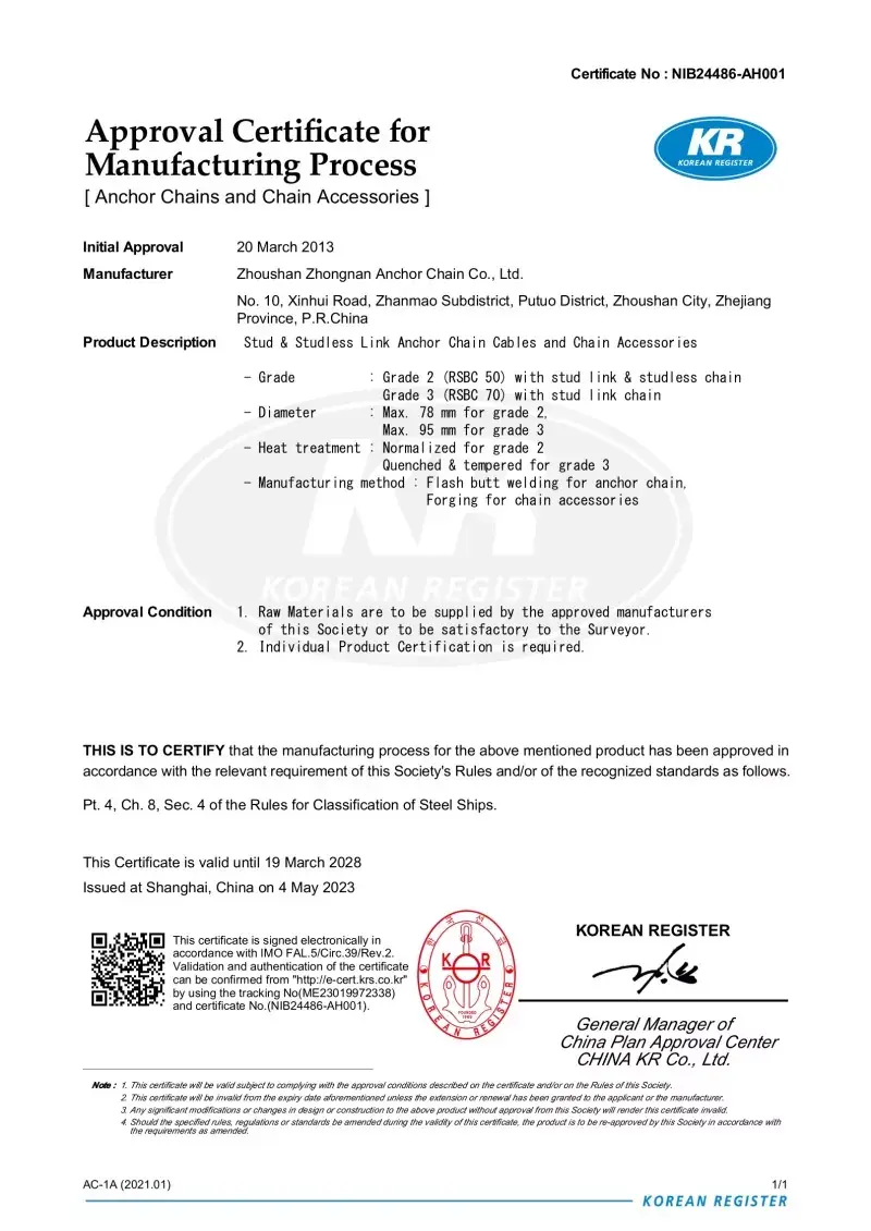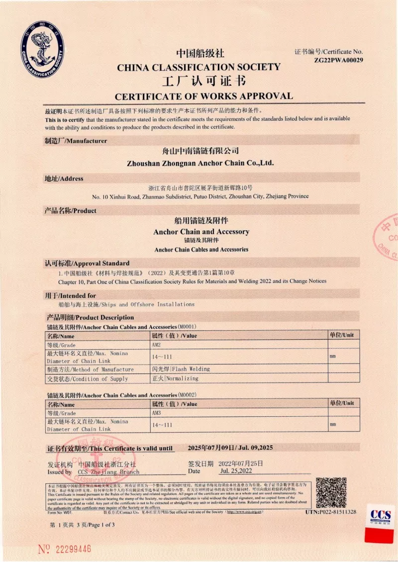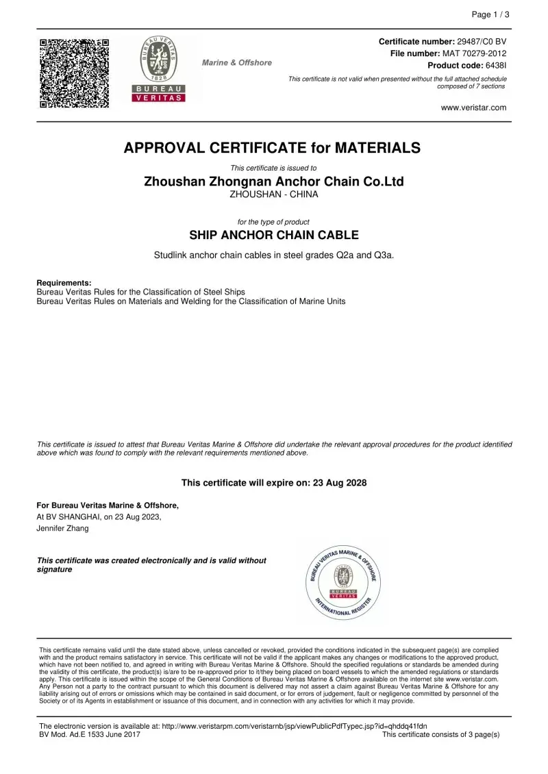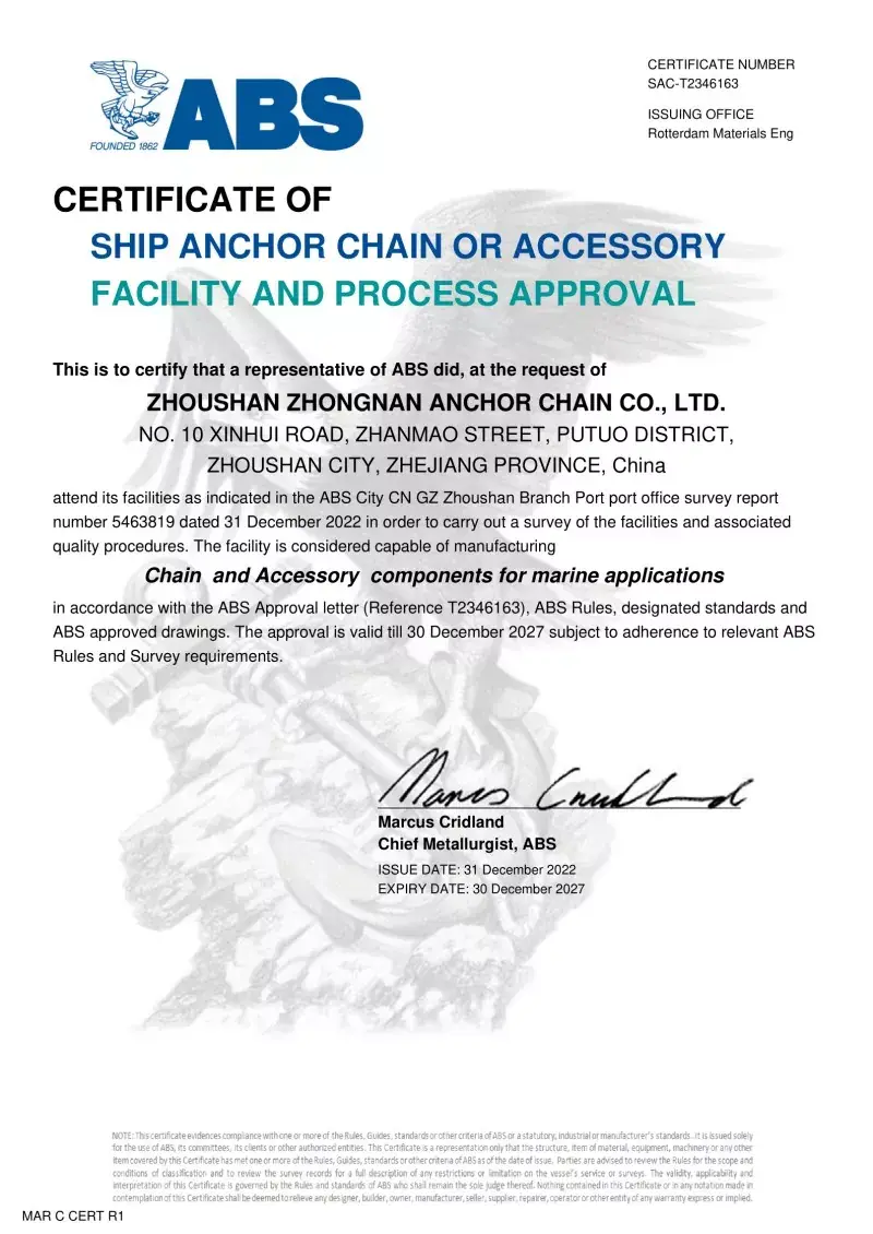 Bəli. Fabrikamızda istehsal olunan hər bir zəncir, CCS, ABS, DNV, BV, LR, NK, Rina, KR və RS kimi aparıcı beynəlxalq təsnifat cəmiyyətlərindən sertifikatlaşdırma ilə gəlir. Bu sertifikatlar zəncirinin IACS və ISO standartlarına riayət etməsi və onun sübut yükü və yük spesifikasiyalarını pozdu.