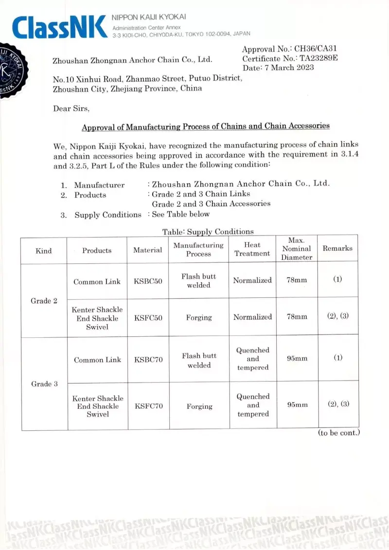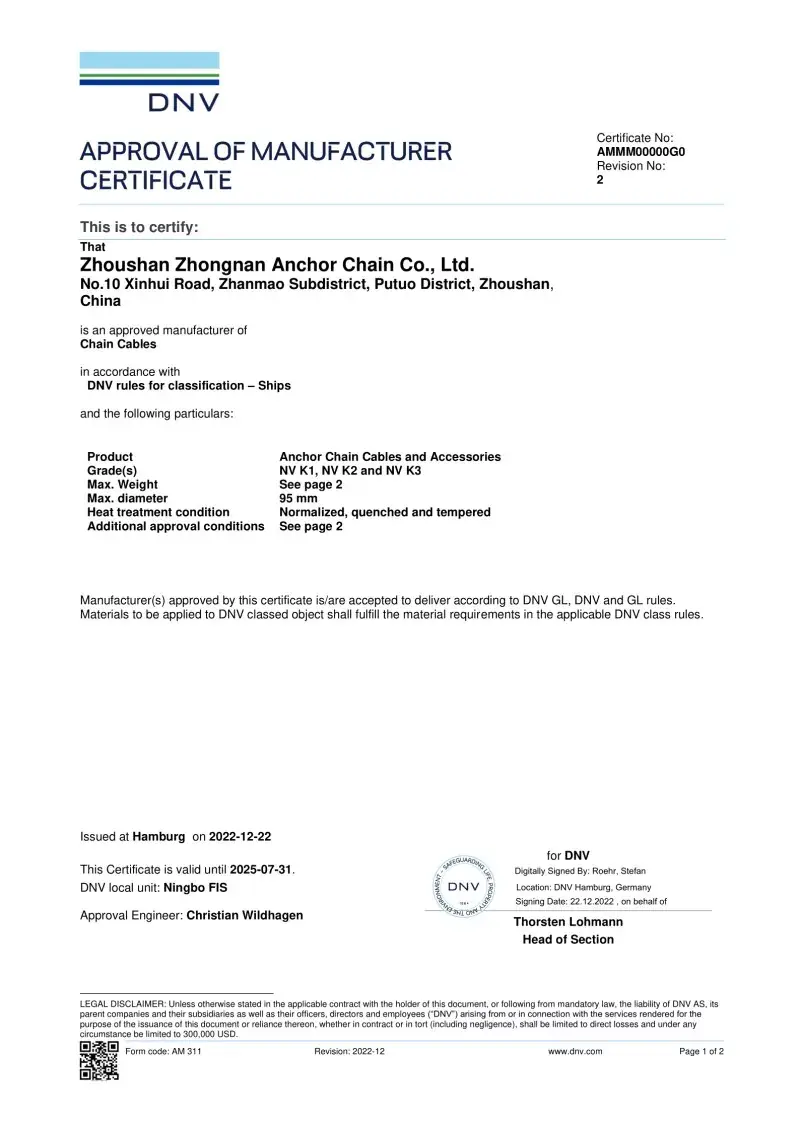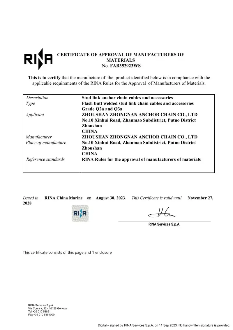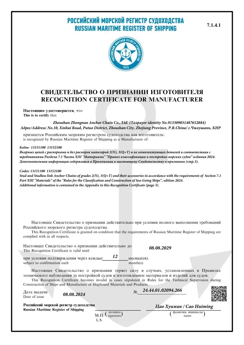 Bəli. Fabrikamızda istehsal olunan hər bir zəncir, CCS, ABS, DNV, BV, LR, NK, Rina, KR və RS kimi aparıcı beynəlxalq təsnifat cəmiyyətlərindən sertifikatlaşdırma ilə gəlir. Bu sertifikatlar zəncirinin IACS və ISO standartlarına riayət etməsi və onun sübut yükü və yük spesifikasiyalarını pozdu.